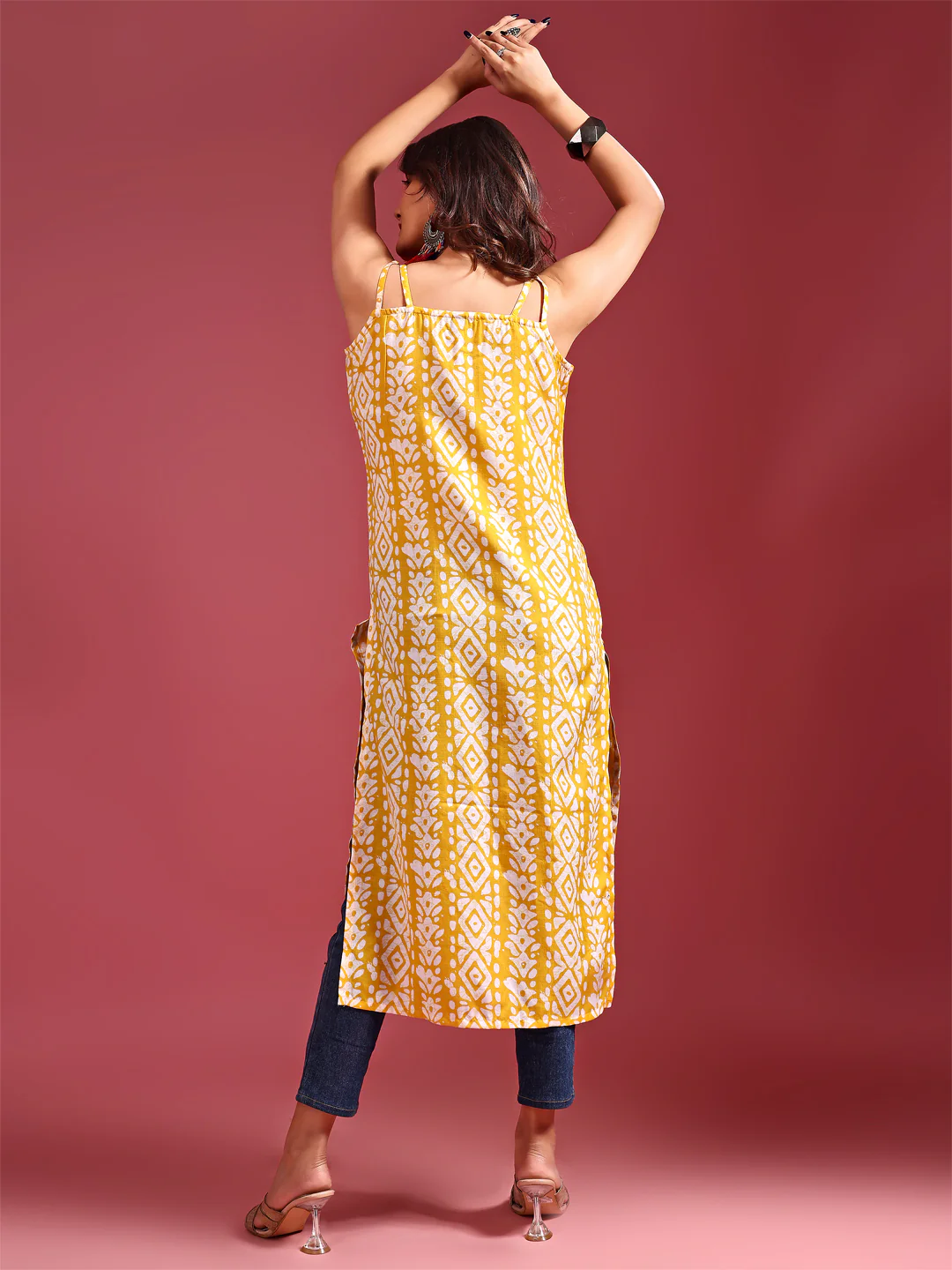 Be the first to review “Cotton Blend Yellow Embroidered Batik Print Straight Shoulder Straps Summer Kurta”