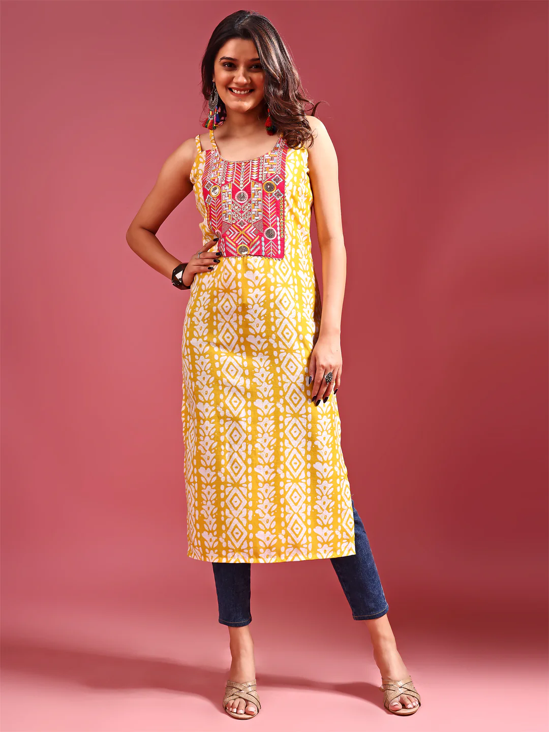 Cotton Blend Yellow Embroidered Batik Print Straight Shoulder Straps Summer Kurta