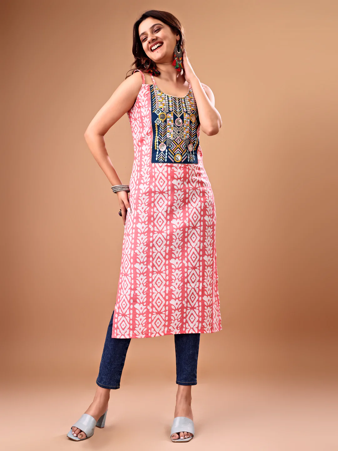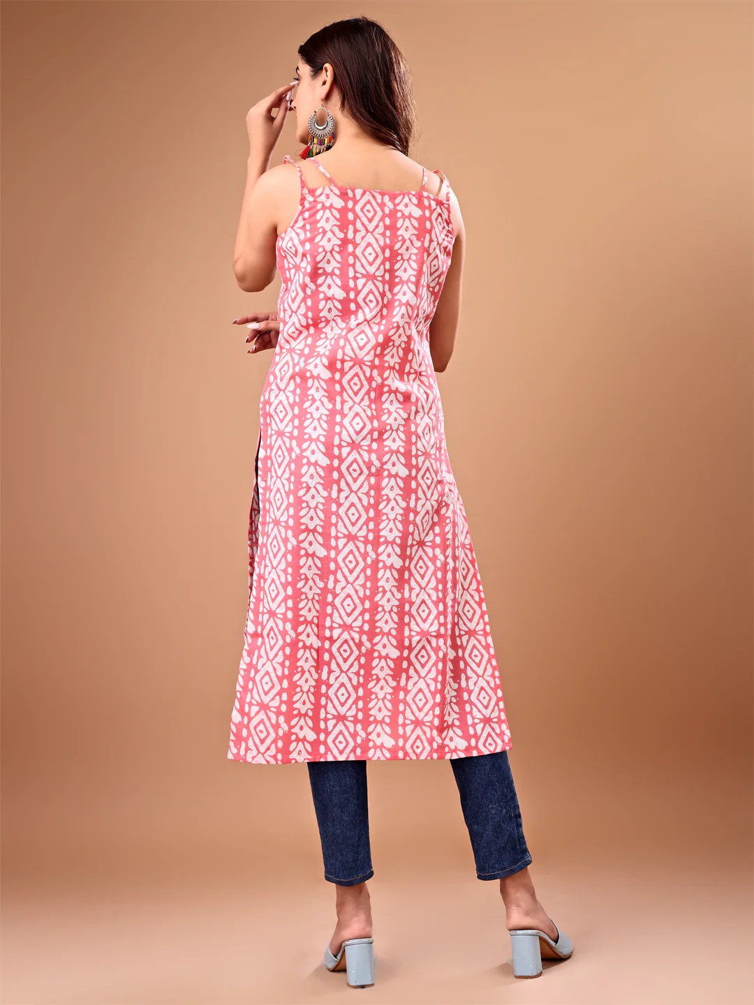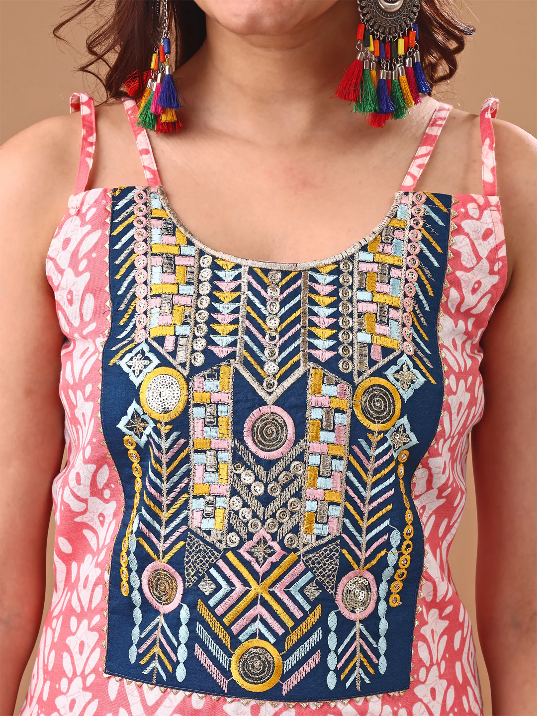 Pink Cotton Blend Embroidered Batik Print Straight Shoulder Straps Summer Kurta