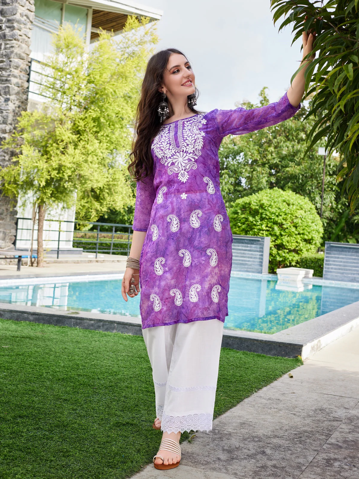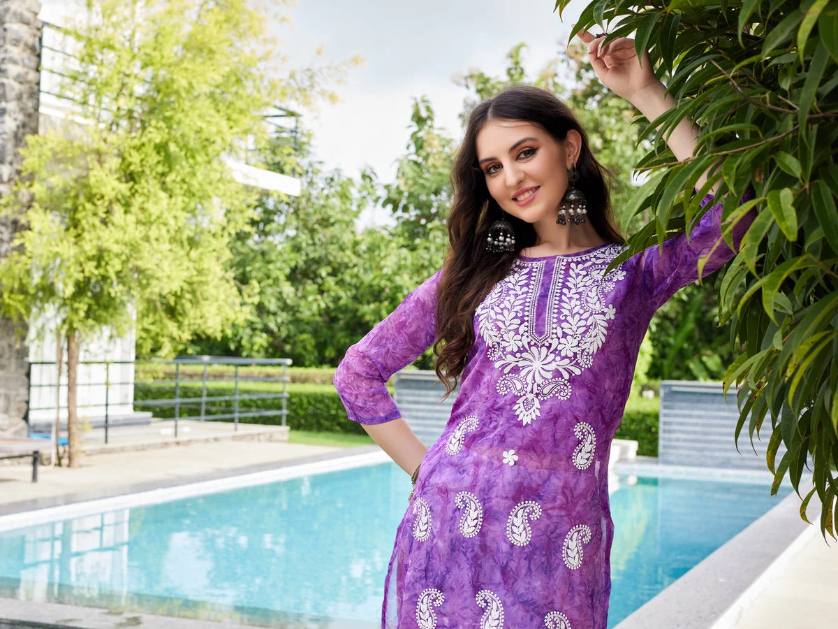 Purple Georgette Chikankari Embroidery Straight Kurta